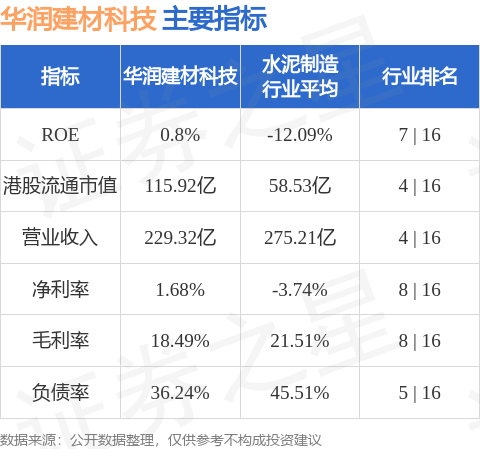 华润建材科技港股市值115.92亿港元,在水泥制造行业中排名第4。主要指标见下表: