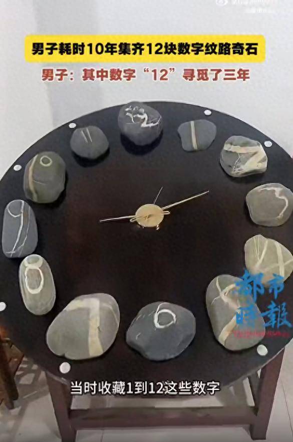 收藏者荀先生介绍,他最初因偶然获得几块带有数字纹路的石头而萌生创意,决定集齐所有“数字”。其中,纹路酷似数字“12”的石头最为难寻,耗费了三年多时间才最终觅得。这套“天然时钟”完全由天然石头组成,每一块石面上的纹理都未经人工雕琢,形似数字1至12,浑然天成。