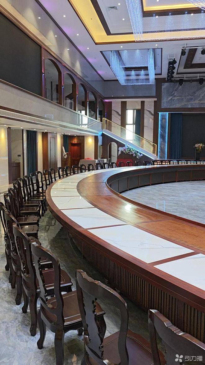 华通大厦顶楼的这间宴会厅,总面积达900余平方米,步入其中,目光便会被这张巨型环状红木桌牢牢吸引,整个大厅的空间几乎被它完全占据。圆桌采用精巧的圆环套圆桌设计,外圈主体之内,还内嵌一张尺寸稍小的内圈圆桌。头顶璀璨的水晶吊灯流光溢彩,桌面铺设的大理石反射出洁白柔和的光晕,搭配红木温润的质感,让整个宴会厅更显气势恢宏、格调不凡。