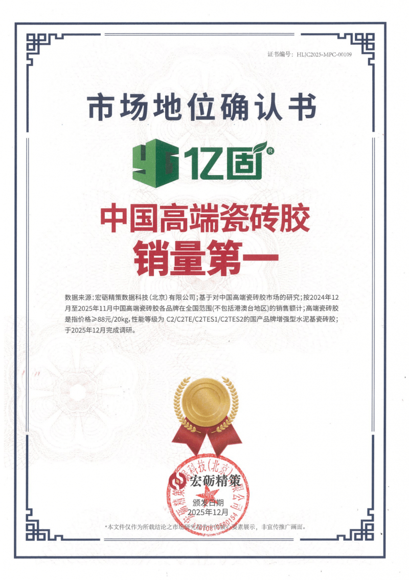 在性能层面,宏砺精策认证的销量第一,聚焦于高变形、高粘结的C2及以上增强型瓷砖胶市场。该等级产品是铺贴岩板、大规格瓷砖的必需选择。亿固在此赛道的领先地位,证明其产品在柔韧性、粘结强度等核心指标上已达到行业顶尖水平,能够从根本上解决空鼓、脱落等施工难题。