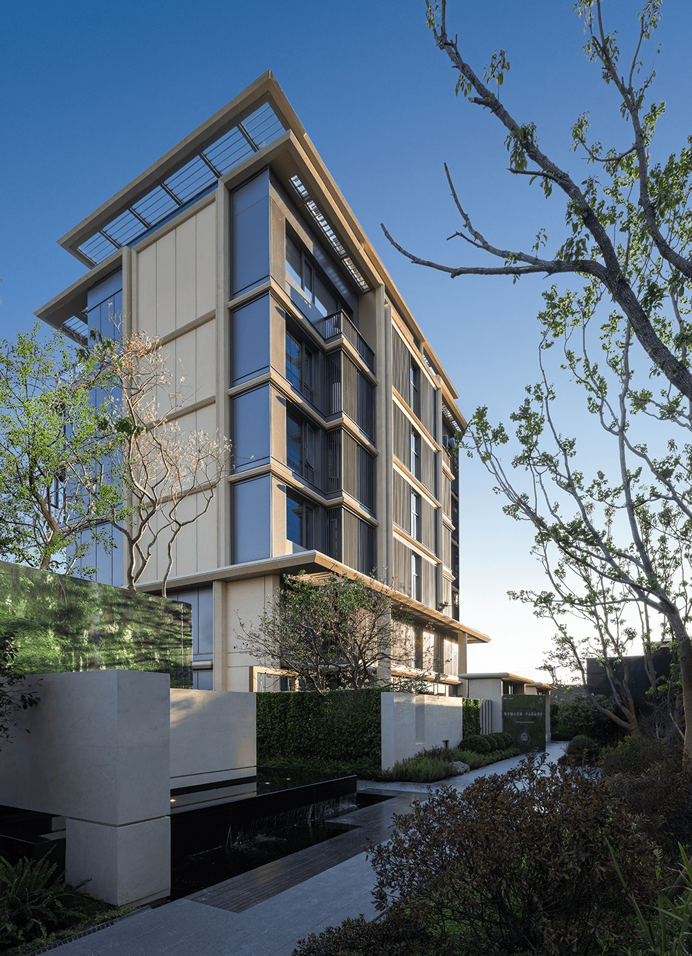 项目叠墅外立面是东方巴黎2.0美学的迭代,采用米色仿石铝板筑就“流光钻幕”,格栅顶冠造型,展现建筑形体的挺拔感和精致感。